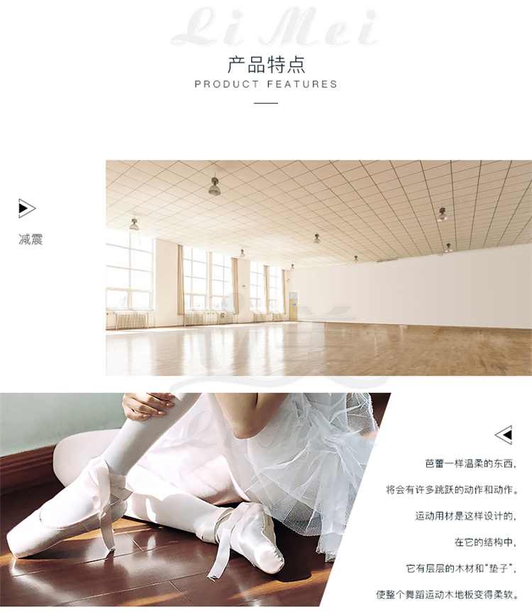 芭蕾舞是一個(gè)很優(yōu)雅的舞種,芭蕾舞重要的一個(gè)特征即女演員表演時(shí)以腳尖點(diǎn)地。那么用什么運(yùn)動(dòng)木地板才能防止我們的女演員受傷呢?則需要用到立美芭蕾舞舞蹈運(yùn)動(dòng)木地板了。