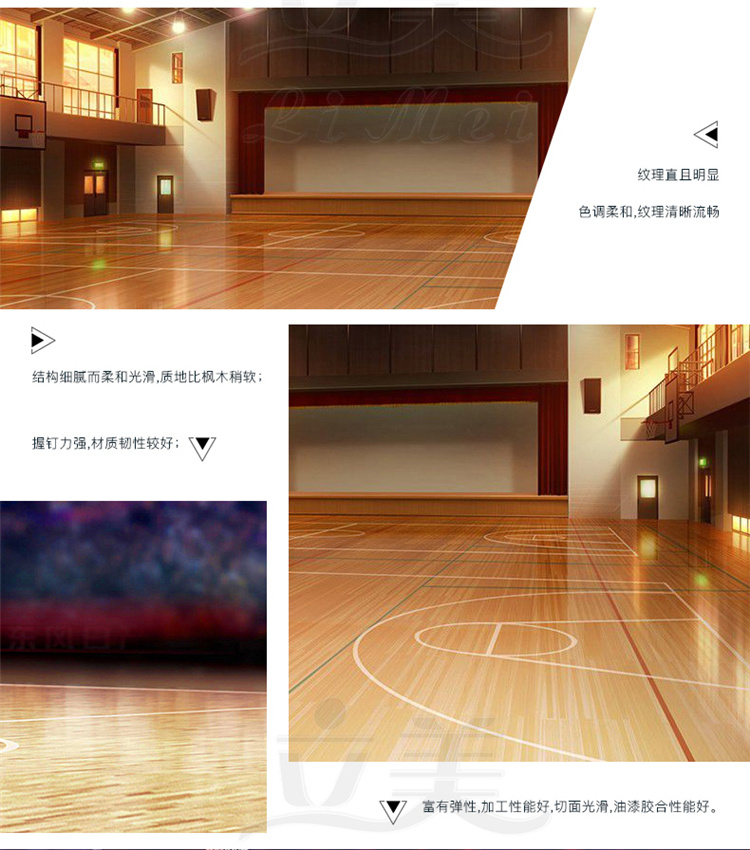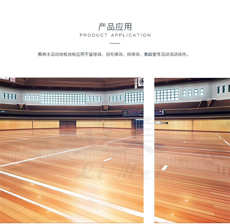 楓樺木運動地板地板應(yīng)用于籃球場、羽毛球場、排球場、舞蹈室等運動活動場所。