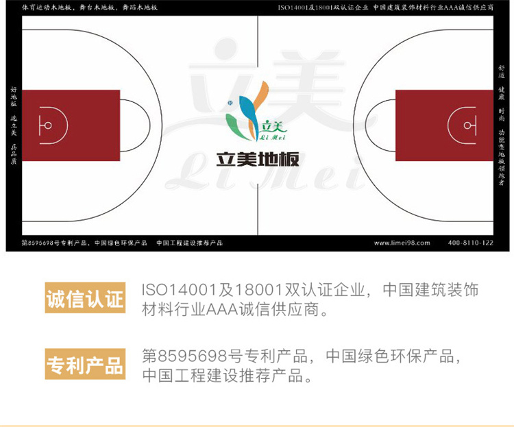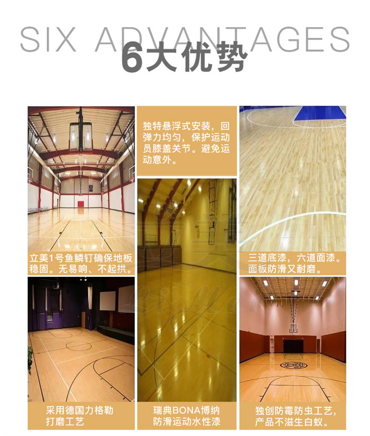 3、運(yùn)動(dòng)木地板具有耐磨、耐腐、消震、吸音性能;