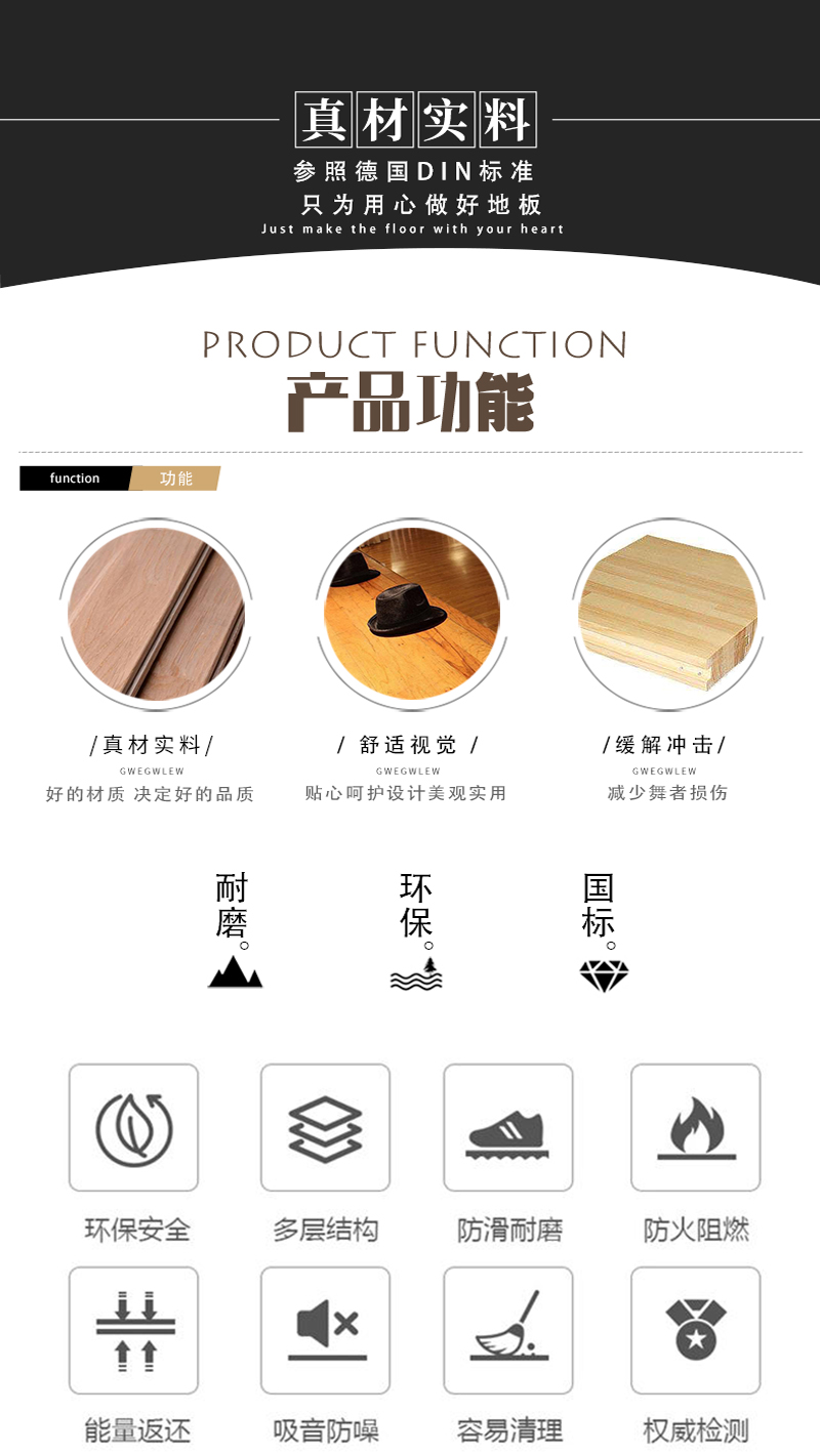 2、舞者在表演過程中,舞臺木地板太滑或者是太澀,都會嚴重影響舞蹈演員真實的發(fā)揮水平,所以舞臺運動木地板的摩擦系數(shù)必須為0.4—0.7,即國際標準。嚴格的摩擦系數(shù)更保證了舞者的使用安全性。
