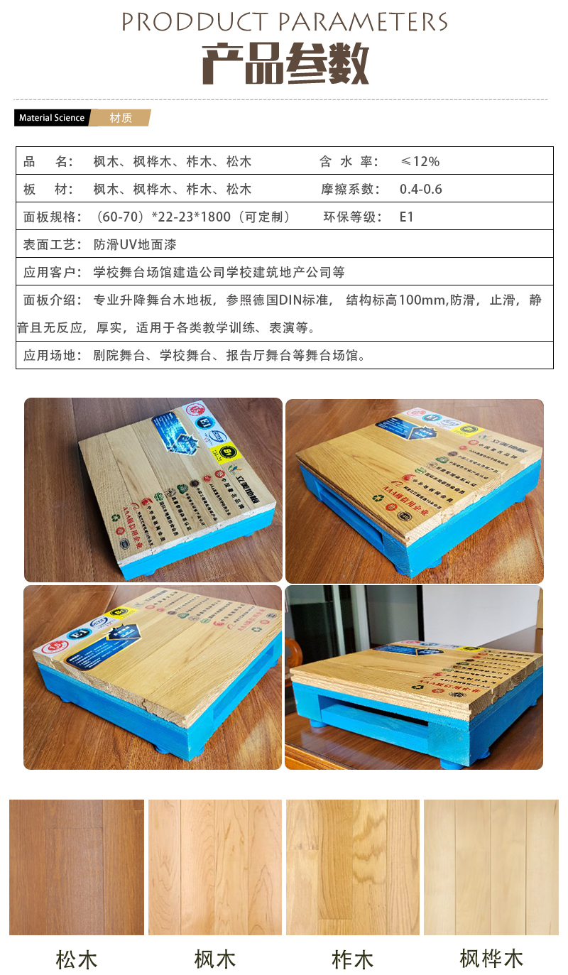 3、舞臺運動木地板在使用中,大多使用較硬的純木質樹種型材,來對其進行加工制作。比如楓木或柞木作為舞臺運動木地板的原材料,經(jīng)加工后這樣的樹種其材質整體木纖維相對較長,從而造就舞臺運動木地板在使用過程中具有很強的硬度,終舞臺木地板的表面承重力、堅固性、耐磨性會非常好。