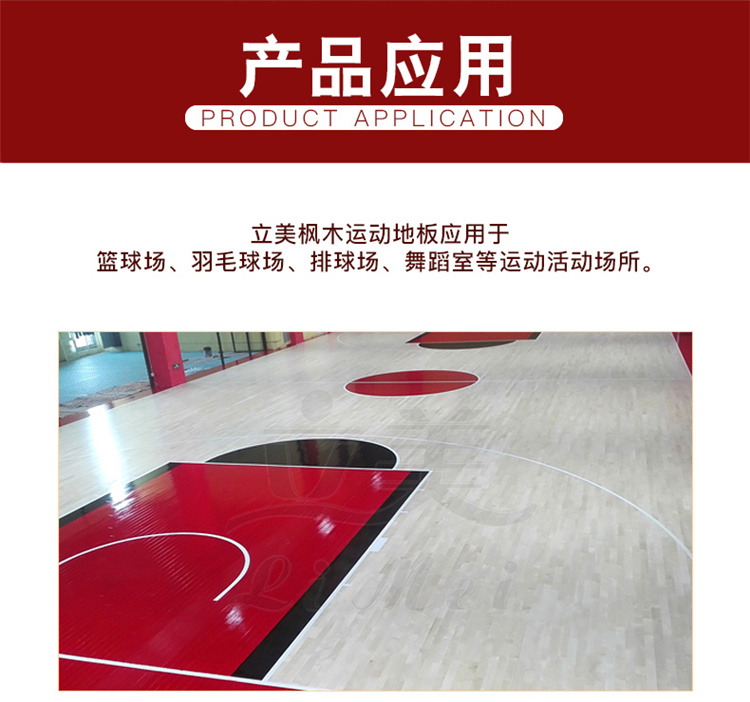 立美楓木運動地板應用于籃球場、羽毛球場、排球場、舞蹈室等運動活動場所。