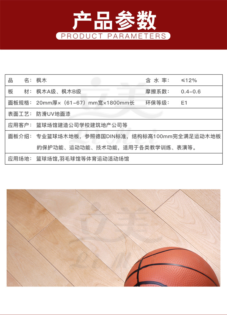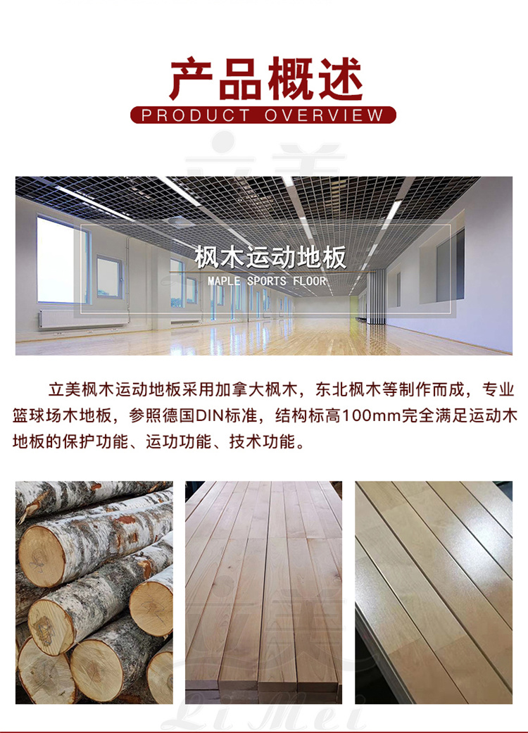 立美楓木運動地板采用加拿大楓木,東北楓木等制作而成,專業(yè)籃球場木地板,參照德國DIN標準,結構標高100mm完全滿足運動木地板的保護功能、運功功能、技術功能。