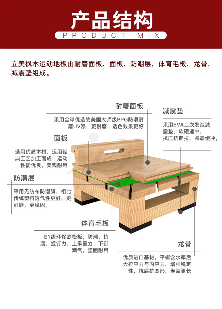 立美楓木運動地板由面板,防潮層,體育毛板,龍骨,減震墊組成。