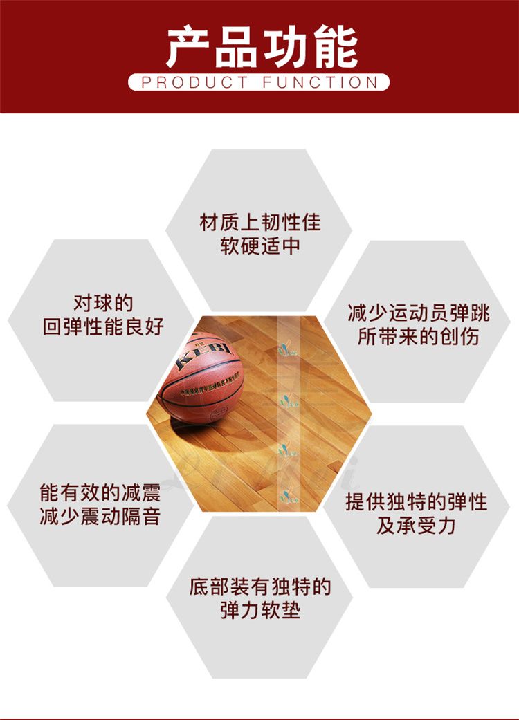 | 面板介紹: | 專業(yè)籃球場木地板,參照德國DIN標準,結構標高100mm完全滿足運動木地板的保護功能、運動功能、技術功能,適用于各類教學訓練、表演等。 | ||||